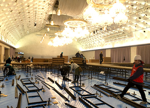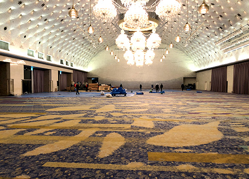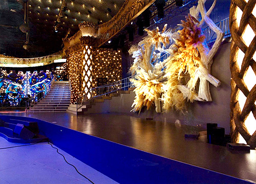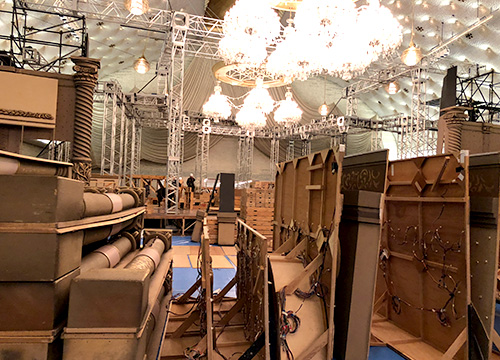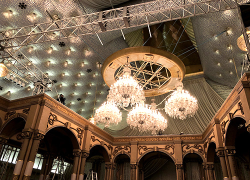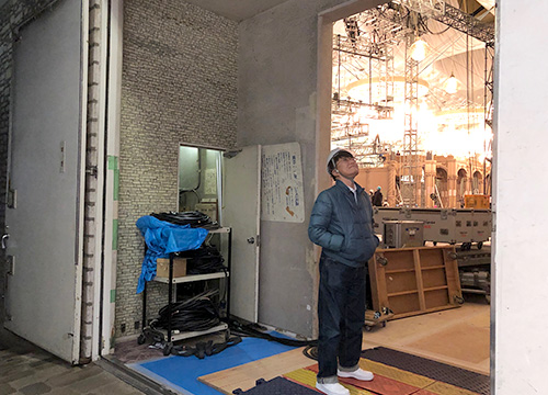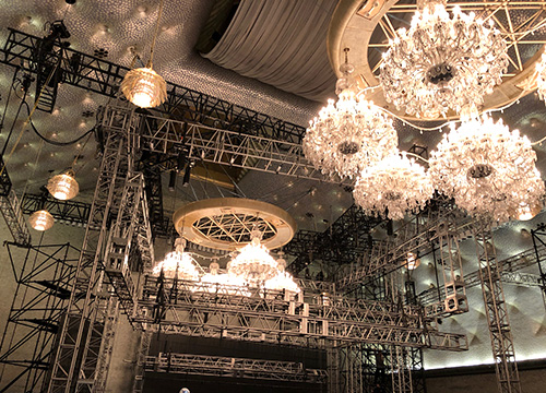 日本最大級のシャンデリアがあるために何もできないという不便さもあります。便利な位置にシャンデリアを持っていきたくても、巨大で重過ぎるので位置は固定。高さも場所も変わらない。シャンデリアを避けながらセットを作りました。
