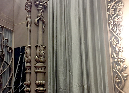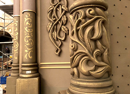 例えば、柱のディテールや質感、色、またステージをカメラが俯瞰で撮った時、バッチリ見える床のデザインも気を抜けない部分。照明のライティングとの調和も考え、色、デザインを決めています。