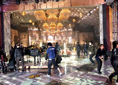 大きな変化は4回。最初のセットでは演出家からとにかく奥の深さを強調する配置希望がありました。そこで会場入り口から奥までカメラレールを長く敷き、ワンカットで見せるセットを考えました。