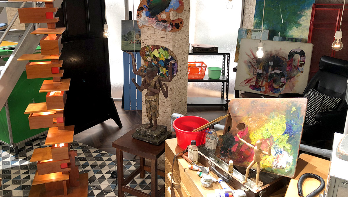たくさんの小物の配置です。飾った後でMCの画(え)の映りを見ると、意外と後ろがうるさすぎるな、とか、吊るし電球の位置をもう少し下げた方がいいかな、とか、いろいろとやり直しが出てきます。飾りのあんばいを見る時は、最初は多めに飾って、そこから画を見ながら引き算をしていきます。いまだに毎回、画を見ながらベストな配置の仕方を探っています。