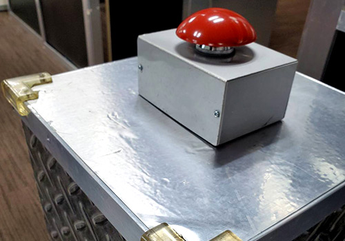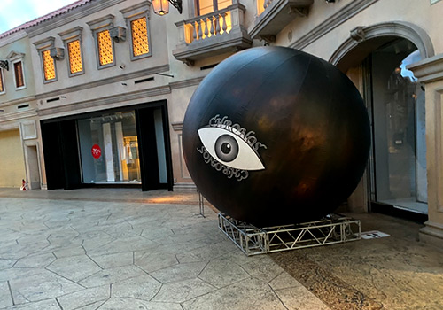 『逃走中』の装置やアイテムは西暦2900年の未来から転送されてきているモノということなので、未来で行われているエンターテインメントショーを想像しながらデザインしてきました。そんな未来世界の企業「クロノス社」の謎に満ちた部分を表現するため、バラエティーでは珍しいのですが、緊張感のある赤と黒とシルバーを多用しています。また、セット内には「クロノス社」のシンボルマークである目玉のロゴを随所に入れています。装置や印刷物など様々なところにレイアウトしていますので是非探してみてください。