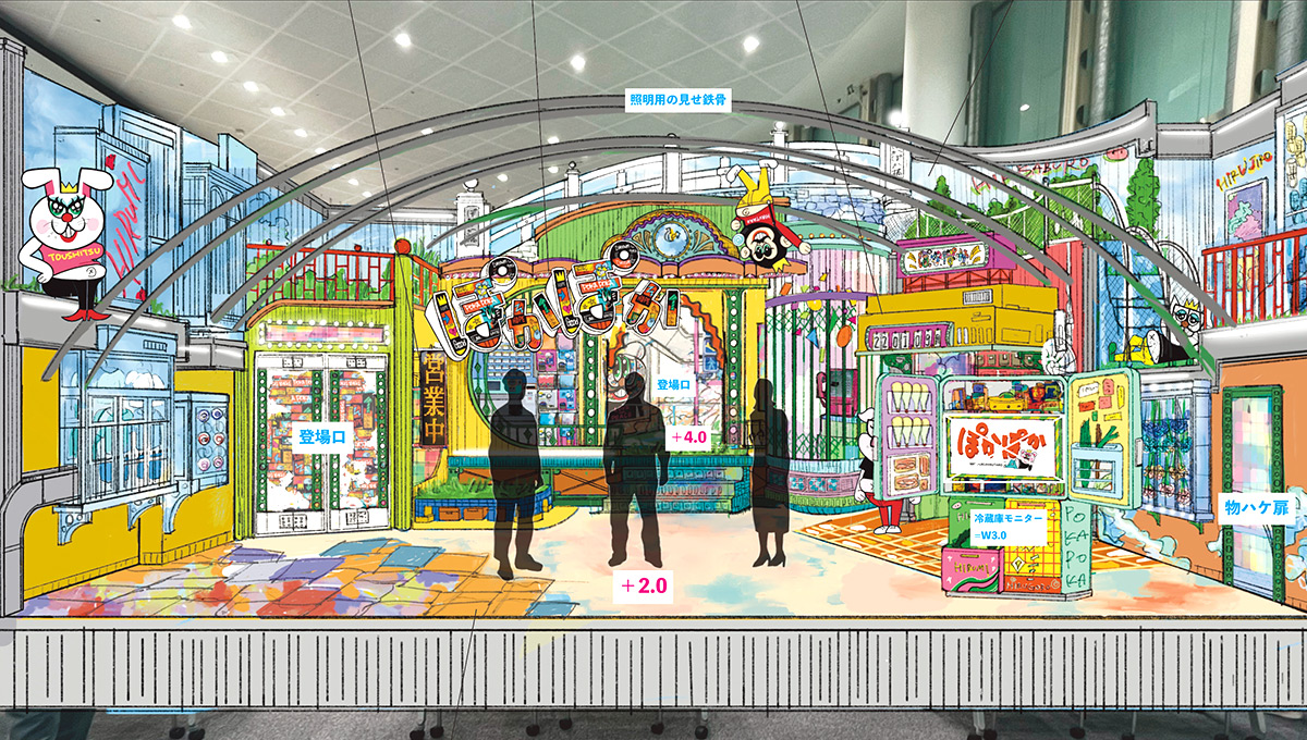 演出や美術スタッフの皆さんに好きにやらせていただけた結果、「曲線あり直線あり、書き割りもあり、スチロール造形あり」と何でもアリの、見た目にも楽し気なセットになったかなと思っています。ステンドグラスや自動販売機の飲み物、のれん、ガチャガチャなどのビジュアルデータもすべて自ら作成しているので、細かい部分にも注目して、番組を楽しんでいただけると嬉しいです。