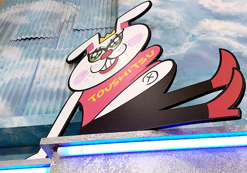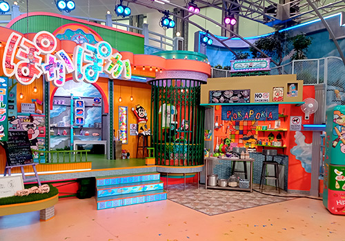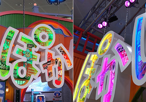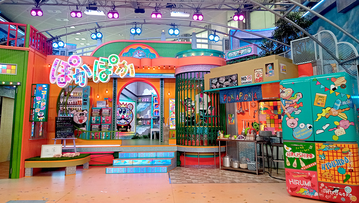 番組ロゴの吊り看板もカラフルに。ビミョーな凹凸が