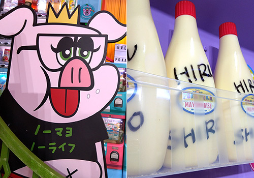 はい。スニーカーやTシャツ、スケボー、お花、お菓子など。演出サイドからの要望もありますが、あとは装飾スタッフとあれこれ話しながら集めました。番組としてのメインの色が15種類もあるので、同色のグラデーションというよりはそれぞれの色をどう配置するかを意識して飾っています。他にもロゴやキャラクターの着ているシャツなどに、青山さんならではの文字が入っているんです。昼四郎の胸に「ノーマヨ、ノーライフ」とか。そこに引っかけてマヨネーズに名前を書いてボトルキープにしてみたり。細かい遊びをいろんなところでやってます。