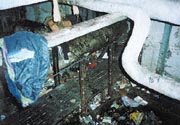 マンホールの中には、足の踏み場もないほどのゴミや食べかすが散乱して悪臭がたちこめ、また路上にあいたマンホールの穴から差し込む光以外に明かりはなく真っ暗で、とても生活していけるような環境ではありません。