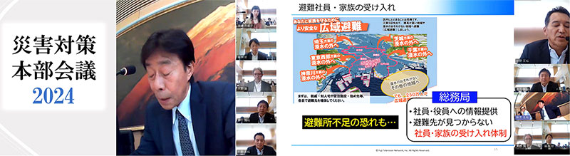 - そうですね。スーパー台風の直撃などによる首都圏被災のリスクも現実味を帯びていますし、都心でも河川氾濫が起きうることから、備えの重要性が年々高まっています。そうした状況を受けて、今年の秋の防災ウィークでは、初めて「水害」や「浸水」対策をテーマに、災害対策本部会議を開催しました。その様子はアーカイブとして配信し、社員やスタッフの皆さんに見ていただきました。