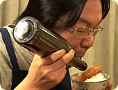 帰宅してお風呂に入る男。手にしたビール瓶で体を洗い出す。風呂上りの夕食の支度もビール瓶で野菜を切ったり炒めたり。食事もお箸の代わりにビール瓶で・・・。そこにエコ・メッセージ → 「ビール瓶の回収率は99% 一本で平均8年間・約25回繰り返して使用されています」