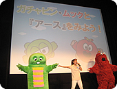 映画『アース』は『プラネット・アース』シリーズのスタッフが製作年数5年、世界中を回り200箇所以上の場所で撮影された驚異のドキュメンタリー映画です。ちょっと大人向けのこの映画を子どもたちにも判りやすく見てもらえるよう、ゲストに迎えたのがガチャピンとムック!本編上映中にもガチャピンとムックに解説を入れてもらったことで小さな子どもにもあきることなくみてもらうことが出来ました。