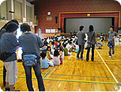 「いきものがかり」の皆さんの協力で、極秘リハーサルも無事終了した頃、リュックと水筒を持ったこども達が体育館に集まってきました。お世話するお母さん方がキビキビとこども達を整列させます。結束の固い子ども会なのです。