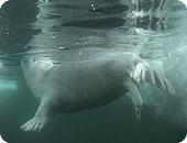 水中を泳ぐアザラシの赤ちゃん動物カメラマンの小原さんは、流氷の減少と、アザラシの生態には、密接な関係があると、写真集で伝えています。
