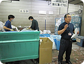 | 清掃スタッフが各職場の分別ごみ箱 から回収したゴミが、ストック ヤードに集まります。全体の流れに ついて説明を受ける代表委員たち |