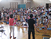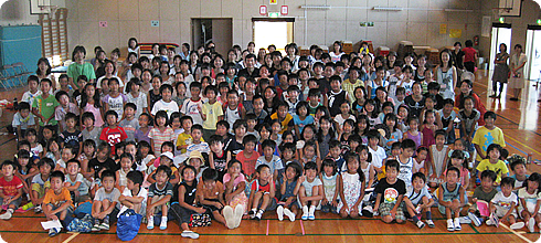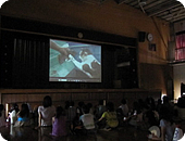 「にゃんこ THE MOVIE 4」上映会とアナウンサー朗読会を実施した日は猛暑日。体育館は冷房が無く、さらに映画の上映とあって暗幕を垂らすため、まさに蒸し風呂状態。集まった200人を超える子ども達とお母さん、お父さんたちは、持ち寄った扇風機と保冷剤で熱中症対策を施しながら全員で楽しみました。