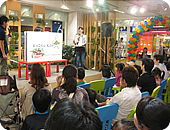 続いて春日アナがオリジナル大型紙芝居「ハロー!どっこくん-チョコリン大魔王が襲ってきた!の巻-」を朗読。子ども達は、どっこくんの大活躍と四季折々の食べ物の登場に興味深く聞き入っていました。
