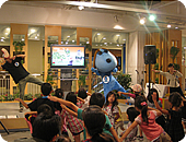 最後は、みんなで「どっこくん」体操に挑戦。これは腸を刺激したりバランスをとったりして排泄をうながそうというもの。ここでラフくんが登場し会場の子ども達は大喜び。オリジナル曲『ハロー!どっこくん。』に合わせて、ラフくんと一緒に元気一杯に踊りました。ラフくんのどっこくん体操は見ごたえがあり楽しさ倍増。30分間のイベントは盛り上がって終了しました。