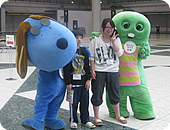 この日の最後は東京ビッグサイト。ここにはおよそ15人の子ども(3/26現在)が避難生活をしています。少ない人数でしたが、広いスペースでガチャピンとラフくんとの束の間の触れ合いを楽しんでいました。