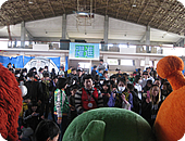 次に向かったのが、足立区にある東京武道館。ここは約300人の避難者がいて、会場となった武道館内の講堂には60人ほどの子どもたちが集まりました。震災後1週間以上も避難所暮らしとあって、子どもたちはガチャピンとラフくんと写真撮影をしたり握手をしたり、またかけっこをしたりと大はしゃぎの1時間ほどでした。
