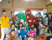 まず最初に訪れたのは調布市の味の素スタジアム。ここには主に福島第一原発事故の影響で避難している家族150人ほどが生活しています。この日集まった子どもたちはおよそ40人。琉球獅子舞の飛び入り参加もあり、子どもたちは大喜びでした。最後にラフくんカレンダーを子どもたち全員に手渡しして会場をあとにしました。