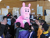 次に、赤浜小学校避難所を訪問。30名程の小学生に要望のあつたパズルやゲーム、文房具などを届け、大槌町最後の訪問地大槌北小学校へと向かいました。大槌北小は津波で1階が浸水、この日は大槌高校内の仮教室で始業式前の事前学習日、1年生から6年生まで100名ほどの児童が集まりました。本来はパソコン学習用の教室でのミット君との交流会でしたが、とても賑やかで元気な子どもたちの声が響いていました。