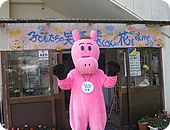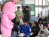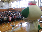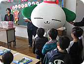 始業式の壇上で、ふくたんが子どもたちの代表にノートや遊び道具をプレゼント、その後、新1年生の教室で交流会・握手会を行いました。思わぬ人気キャラクターの登場に子どもたちの歓声が教室中に響いていました。
