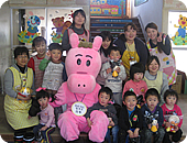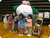 この日はおよそ50人の子どもたちがふくたんを迎えてくれました。ホールの隅に特設されたキッズコーナーで握手をしたり記念撮影をし、持ってきたおもちゃや文具をみんなに差し上げました。特に女の子たちにぬいぐるみは大人気。胸に抱えて嬉しそうな姿が微笑ましく感じられました。