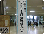 この日の最後は、福島市郊外にあるあづま総合体育館。入口付近にあった「ふくしまは負けない」ののぼりが印象的でした。被災当初は2,500人くらいの避難者がいたそうですが、現在は近隣の温泉旅館などに移った人たちもいて1,000人を割っているそうです。