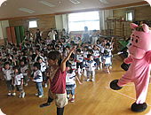 震災から4か月が経ち、フジテレビが継続して行っている「こどもおうえんプロジェクト」では、7月22日、岩手県宮古市の2か所の幼稚園で、「こどもおうえんプロジェクト・食育出前授業『ハロー!どっこくん。』」を開催しました。