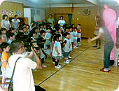 7月22日、ホテルを早朝に出発し、ひとつめの幼稚園、宮古市のひかり幼稚園に到着。そこには、外で元気に元気に走り回る子ども達の姿が!少しほっとした気持ちになったところで、準備に。すでにDVDの音を聞きつけてホールを覗き込んでくる子ども達も(笑)。