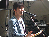 木漏れ日がキラキラとふりそそぐ野外ステージで、今回のイベントは行われました。少しでも近くで絵本に触れてほしい…そんな想いから、ステージには上らず、あえて客席の最前列で朗読しました。
