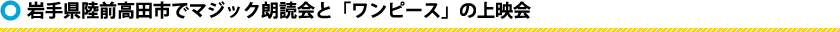 5月19日、陸前高田市にあるサンビレッジ高田で、牧原俊幸・梅津弥英子両アナウンサーの司会による被災地支援イベントを行いました。第一部は牧原俊幸アナウンサーのマジック付朗読会、第2部は、LED大型ビジョンを使った「ワンピースフィルム・ストロングワールド」の上映会を実施、子どもから大人までが来場し楽しんでいただきました。