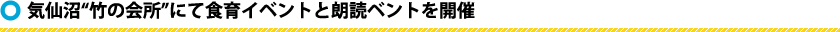 「竹の会所」は、父親、自宅を津波で失った男性が提供してくれた海沿いの土地に、滋賀県立大学 環境科学部 環境デザイン学科(陶器浩一研究室)の学生たちが、地域に生息する竹を使って気仙沼の方々とともに建てたドーム型の空間です。みんなが集まれる場所を…との願いから作られたもので、9月1日にその場所で食育イベントとアナウンサー朗読会とを開催、仙台放送のキャラクター・ジュニくんも参加し、波の音を聞きながら心地よい時間が流れました。