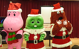 2日間で8ヵ所の幼稚園や保育園にお邪魔し、ガチャピン・ムックそして岩手めんこいテレビのキャラクターミット君、山中章子アナウンサーと共に、クリスマスイベントを開催。合計約1,000人の元気な子どもたちに出会うことができました!サンタクロース姿のガチャピンとムック、ミット君の登場に、子どもたちは大はしゃぎでした。