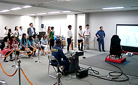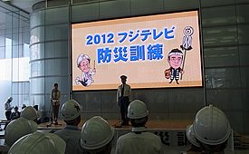 災害発生時に視聴者の皆様のライフラインに関わる重大な情報を提供するテレビ局として、また一企業として、「防災」は重要なテーマです。そのため、フジテレビでは全社的な防災意識の底上げを図るため、年2回(2012年度は9月24日~28日と3月11日~15日)「防災ウイーク」を実施しています。「館内防災もしもツアーズ」と題し、社内の備蓄食糧やAEDの保管場所を確認したり、非常食の試食会を実施。また、「防災プロムナード」では、防災グッズの展示販売や、震災発生時の仙台放送の様子などを動画とパネルで紹介。さらに、「地震ざぶとん」による最新型地震体験や「講習会」なども実施し、社内の防災意識の向上に努めました。また早く正確な災害報道のための、災害即応体制の構築とスタッフのスキルアップをめざし、災害発生を想定した訓練を定期的に実施しています。