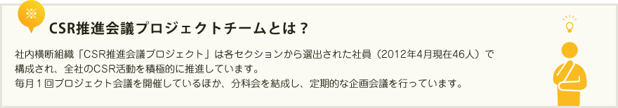 フジテレビのCSR(= Corporate Social Responsibility 企業の社会的責任)活動は、主に「被災地支援」「社会貢献」「環境」の3つに分類されます。2011年3月11日、東日本大震災に見舞われて以降、フジテレビのCSR活動の柱に「被災地支援」が加わりました。未曾有の大震災を風化させない、被災地の方々を忘れないということが、フジテレビが社会に対して約束する「責任」だと考え、2012年度は被災地支援「ずっとおうえん。プロジェクト」を軸に活動を行いました。CSR活動の実施にあたっては、社内の各セクションから選出された※「CSR推進会議プロジェクトチーム」メンバーが真剣に検討し、積極的に推進しています。