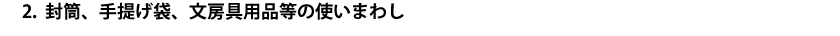 封筒・手提げ袋は一度使った物を再使用し、両面コピー等によるOA用紙削減も行っています。更に、パームファイル、文房具も追加し、省資源・循環型社会形成、及び廃棄物削減を目指しました。