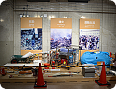 震災直後の崩壊した街をリアルに再現 モニターには川端アナの緊急ニュースが常に流れ緊迫感が… |