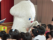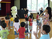 岐阜県関ヶ原町は東海テレビの放送エリアということで、イベントの途中で東海テレビのキャラクター「わんだほ」も登場。ふわふわした「わんだほ」は子どもたちに大人気で、一緒に体操して触れ合うことが出来ました。