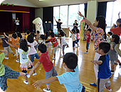 元気に体操する子どもたち紙芝居の後は、「ハロー!どっこくん体操」と「マル・マル・モリ・モリ」を楽しく一緒に踊りました♪♪
