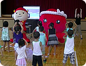 松尾アナとジュニくんまた翌6日の午前には南三陸の名足保育園で、午後には入谷小学校体育館で入谷公民館の主催で食育イベントを行いました。