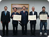 (写真:右から、綜警常駐警備フジテレビ本社ビル警備支所上平文雄司令長・井上公司令補・松永洋樹司令補・フジテレビOB森正行氏・アクアシティ飲食店藤田店長(110番通報者))