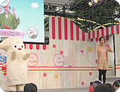 秋晴れの日曜日、沢山のお客さんが集まったエンゼル広場のエンゼルステージで2回の「ハロー!どっこくん」の食育出前授業を行いました。