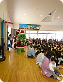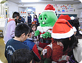 ガチャピンとムックからクリスマスプレゼントを渡し、その後クラスごとに記念撮影しました。どの子もみんな興味津々でガチャピンとムック、そしてミット君に近寄ってきます。抱きついたり、握手をしたり、思い思いの愛情表現を見せてくれました。中には大きさに驚いたのか泣いている子もいましたが、先生も含めてみんなが喜んでくれたので、とてもうれしかったです。