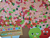 幅2.1メートル、高さ1.8メートルで、「みんなのゆめの木」と名付けられた大きな樹木の下に、ガチャピンとムックが描かれており、来場者の未来の夢をメッセージカードに書いて、お礼にお菓子を差し上げるという企画です。イベント前日、プロジェクトチームメンバー7名で小袋入りのガチャピン・ムックのお菓子750個を、ひとつひとつ両面テープで木に留めていき、パネル一面お菓子となりました。
