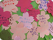 開会前からブースの前で足を停めるお客さまがかなりいました。狭いブースの中で、桜の花の形や葉っぱの形のメッセージカードに「夢」を書く人たちがひしめきあいます。