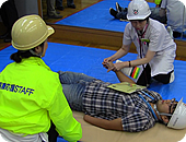 総合訓練では、各局室ごとに設けられた「安全ゾーン」などを確認し、大地震発生の瞬間への対応意識を高めることや、救護所へ負傷者を搬送してのトリアージ訓練、そして館内で火災が発生した想定で初期消火訓練や全館避難誘導訓練を行うなど、より実践的な訓練となりました。