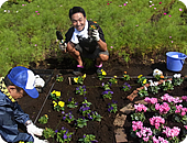厚さ30㎝の土壌が入った四角形の花壇(タテ2m、ヨコ3.5m)、約7㎡の空間に、デザインした花壇を作るのですが、レンガや擬木を並べたり、かわいい花たちや土に触れているうちに、みんな自然と笑顔に。