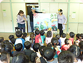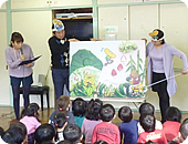 次はオリジナル巨大紙芝居を見ながら、旬の食べ物クイズでは、たくさんの子どもたちが「ハイ!ハイ!」と元気に手を上げて答えてくれました。