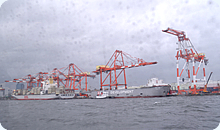 やや強い南風に煽られながら、船は東京港の出口に進みます。定員70人の船室には、中央の大きな楕円形のテーブルを囲むように椅子がゆったりと並び、私たちはそこで港湾局担当者の方の説明を聴きながら、窓ガラスを時折強くたたきつける雨の向こうに見える港湾施設に目を凝らしました。