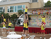 スタンツを入れた演技 チアステージは、ダンスと人を乗せる「スタンツ」と呼ばれるものを入れた演技でまずは会場を一体に。