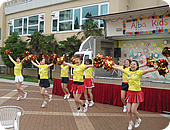 次に、チアの中でも一緒に声で応援をする「コール」というものに合わせて「レッツゴーアルバ!」とみんなで大きな声を出しました。おなかから声を出すと、元気になります!