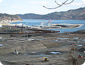 大槌町の海沿いの地域では、山を切り崩した土砂を運搬する大型トラックがせわしなく往復し、ブルドーザーによる盛り土作業が行われていました。城山公園から一望した現在の風景は、以前の美しいリアス式海岸の風情はどこにも無く、茶色い盛り土の工事現場に一変していました。